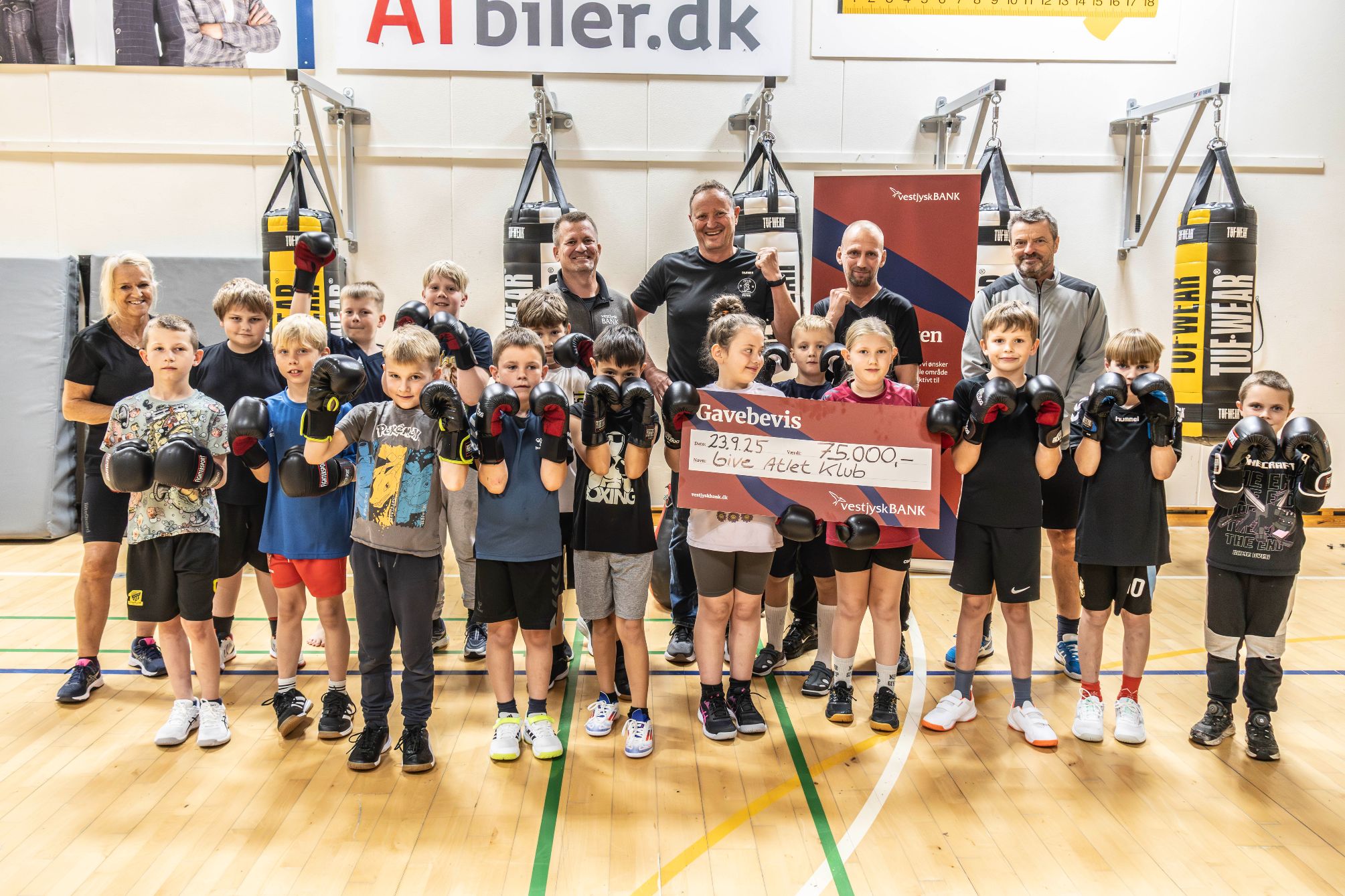 Her har vi så de herlige børn fra Kidz Boksning i Give Atlet Klub sammen med 3 af deres trænere, formanden for klubben Peter V. Tomsen og Lars Bodholdt fra Vestjysk Bank, der denne dag var forbi med en lækker check på 75.000 kroner til klubben. Foto: Jim Hoff