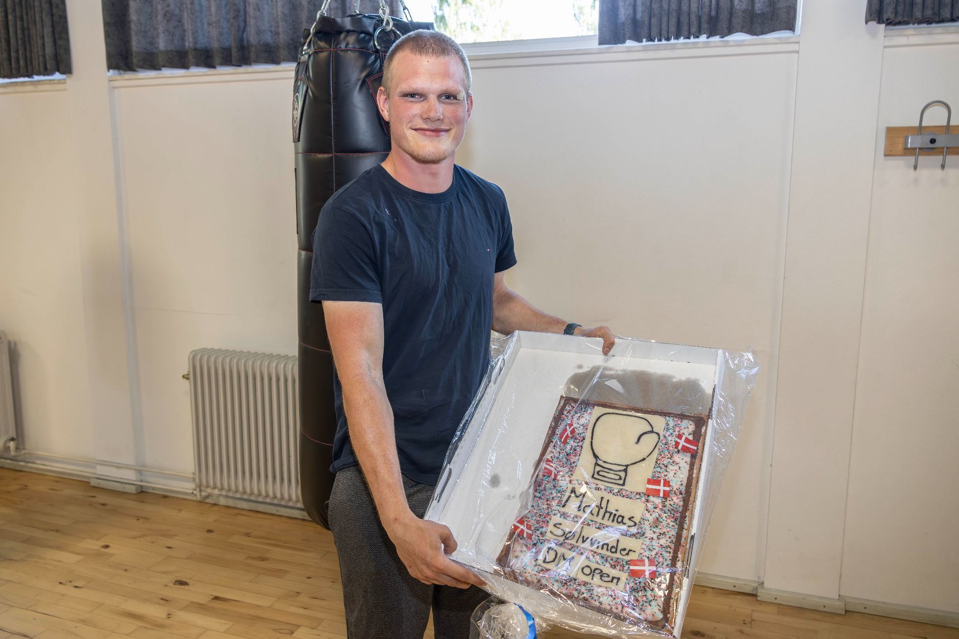Til bokseklubbens træning efter DM-ugen var der pæne ord og en lækker kage til Mathias - og den fik ben at gå på, skal vi hilse at sige. Foto: Jim Hoff