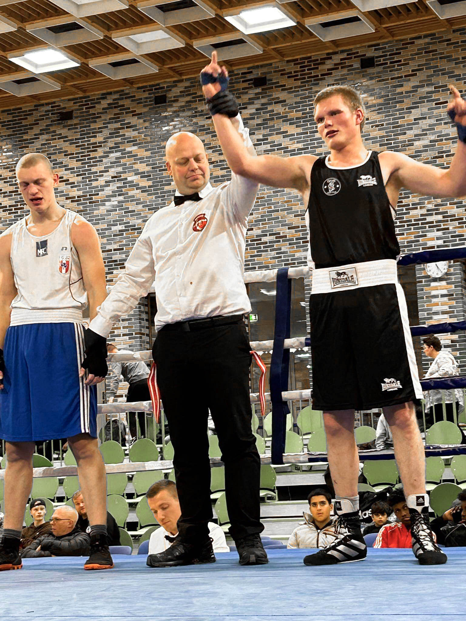 - Det blev en rigtig god weekend for os og for vores to boksere, Martin Johansen og Mathias Holdt. Martin stillede op i cruiservægtklassen, hvor han i sin første kamp mødte Teis Knudsen fra Skive Atlet Klub. Martin havde sin modstander i gulvet to gange i 2. omgang, og så stoppede dommeren kampen, så han vandt på RSC (Referee Stops Contest, red.). I finalen skulle Martin op imod David Farah Bakhsh fra bokseklubben AK Jyden fra Aalborg. En rigtig stærk bokser med 9 kampe under bæltet, og som er rykket ned fra supersværvægt. Martin kæmpede en brav kamp og leverede en mandfolkeindsats, men overmagten var for stor, så Martin tabte kampen på point, men fik da trods alt en flot sølvmedalje med hjem, fortæller Henning.