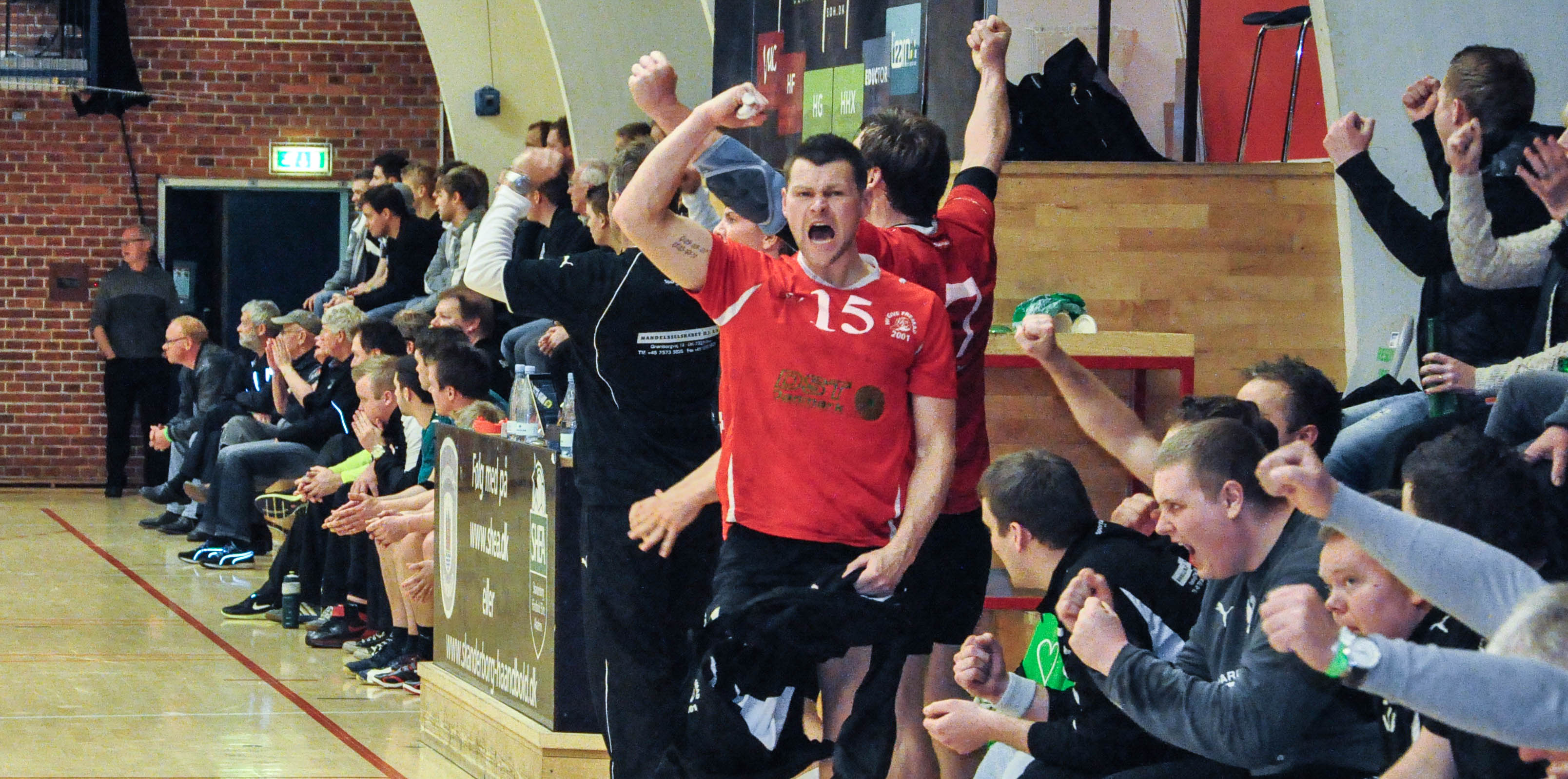 Manden med den gyldne arm, Brian Køhler, jubler her sammen med resten af hallen, da sejren i Skanderborg er i hus. Foto: Jim Hoff