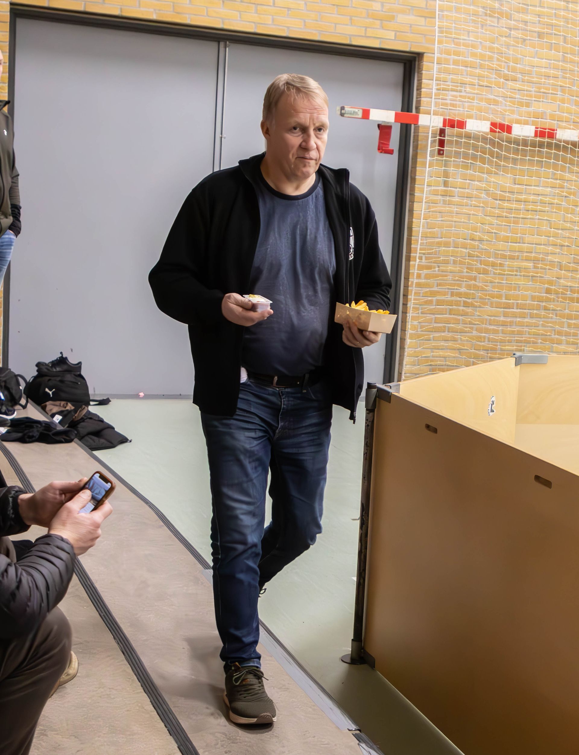 Stævneleder Brian Nielsen er her på vej med forstærkninger til dommerbordet - uden mad og drikke duer heltene jo ikke. Foto: Jim Hoff