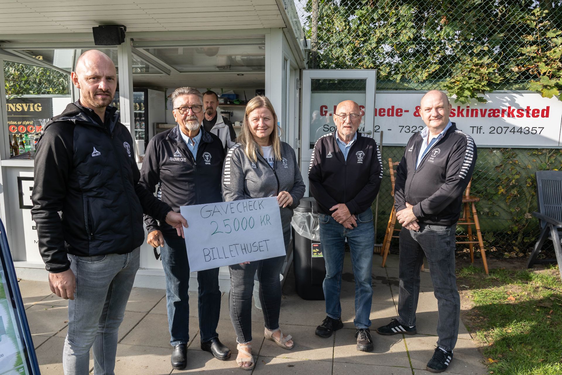 FORENINGSLIV: Lørdag formiddag ved 10-tiden var der en del mere postyr på Give Stadion end normalt på dette tidspunkt. For det første skulle JS-holdet spiller 10.30 mod VB, og for det andet var der en rigtig finceremoni, hvor de fire fra den indledningsvist omtalte “kioskbande” stod klar med en dejlig check på hele 25.000 kroner.