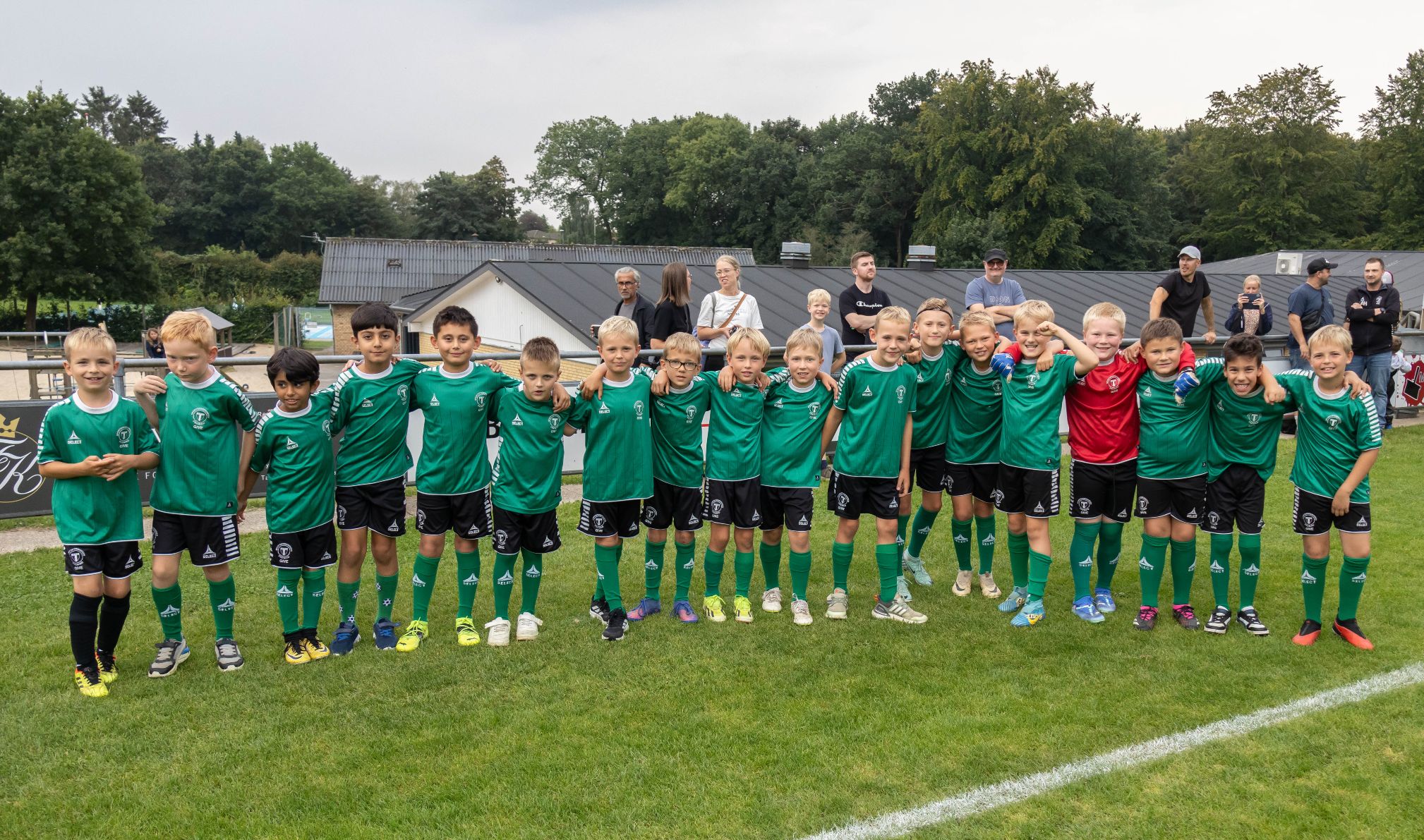 Denne herlige flok ungdomsspillere fra Give Fremad fik æren af at løbe på banen med de to holds spillere. Foto: Jim Hoff