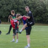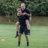 Spillerne blev midtvejs under træningen lige velsignet med et lækkert regnskyl, der gjorde både fodbolddrengene og banen smaddervåde. Og de elskede det - nogle af dem i hvert fald. Foto:Jim Hoff
