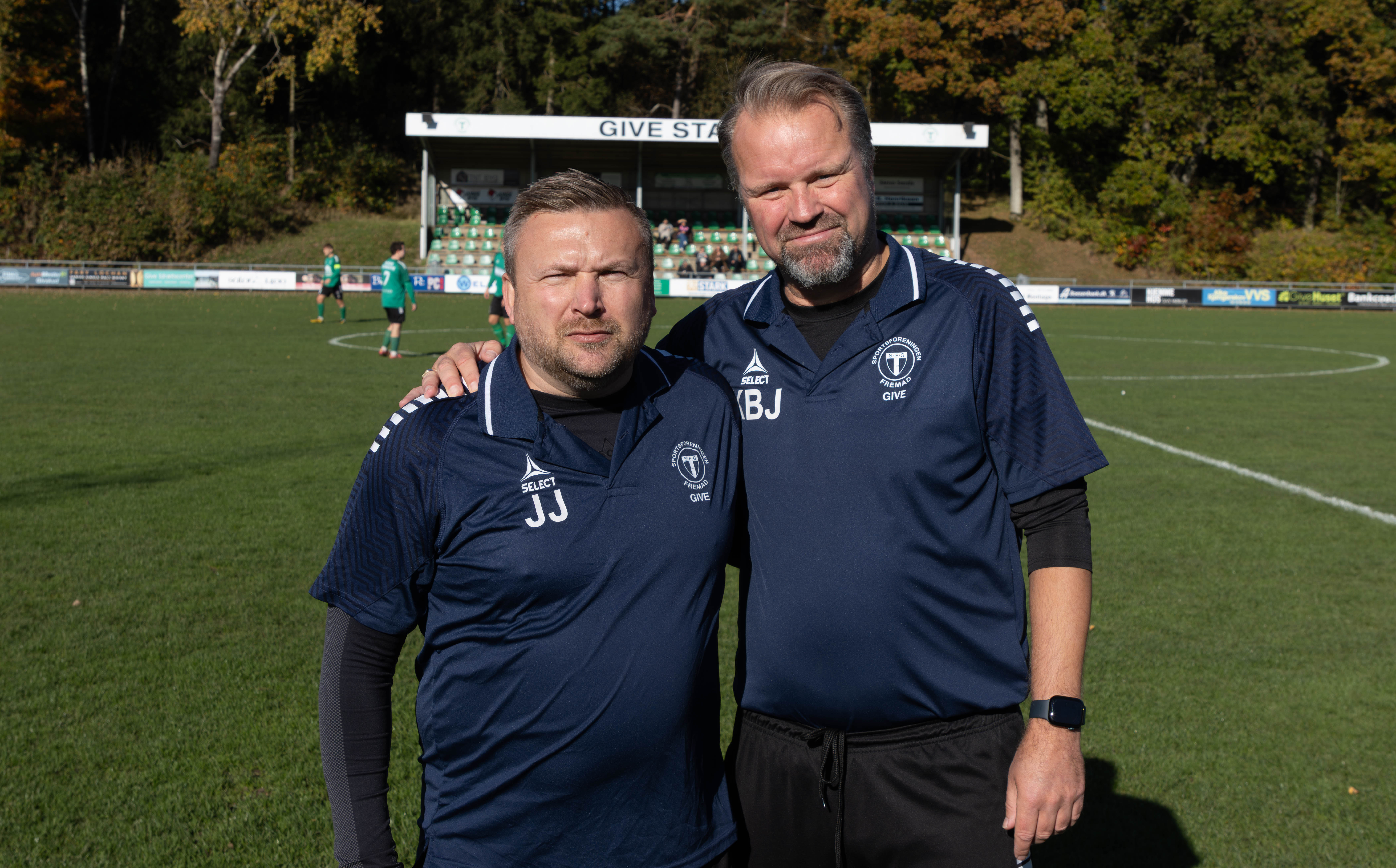 Foto 2: Det var Kasper Bach-Jensen (tv.) og Jesper Jochumsens sidste hjemmekamp som trænere for Give Fremads 1. hold i jyllandsserien. Foto: Jim Hoff
