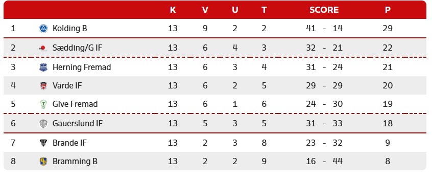 Give ligger dog stadigvæk over Gauerslund i tabellen på trods af nederlaget, idet Give har 19 point for 13 kampe, mens Gauerslund har 18 for samme kampantal. Lige over sig sig har de Varde IF (se tabellen herunder).