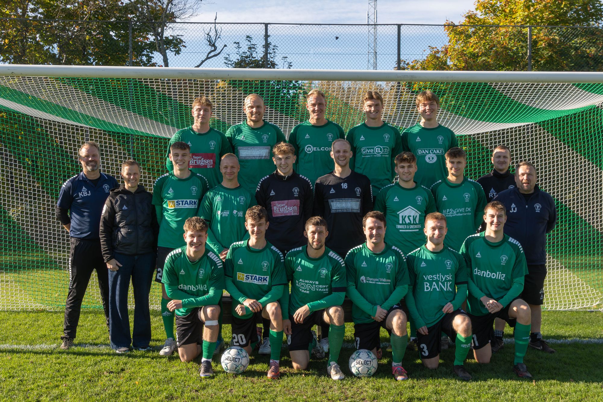 Foto 3: Inden kampen blev 1. holdstruppen med trænere og fys Anette Madsen fotograferet i det fineste efterårsvejr. Foto: Jim Hoff