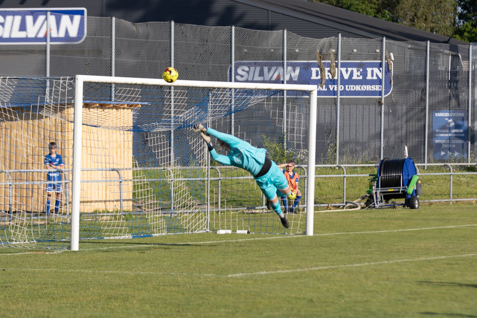 Kolding B-keeper Frederik Bach Jensen er han ude i fuld figur for at redde det fine frisparksforsøg fra Nikolaj Knudsen i 1. halvleg. Foto: Jim Hoff