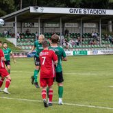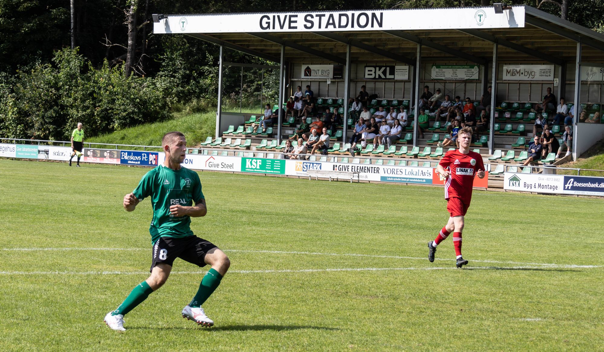 Desværre lukkede Give helt unødvendigt gæsterne ind i kampen igen efter et ikke smart boldtab blot små fem minutter efter 2-0 målet. Målet til 2-1 gjorde ikke noget godt for Give, der mistede momentum, men da Jakob Kristensen idet 45. minut efter en eminent sukkerball af en frispilning trillede Give på 3-1, var der gode fornemmelser at gå på pause på for de grønne.