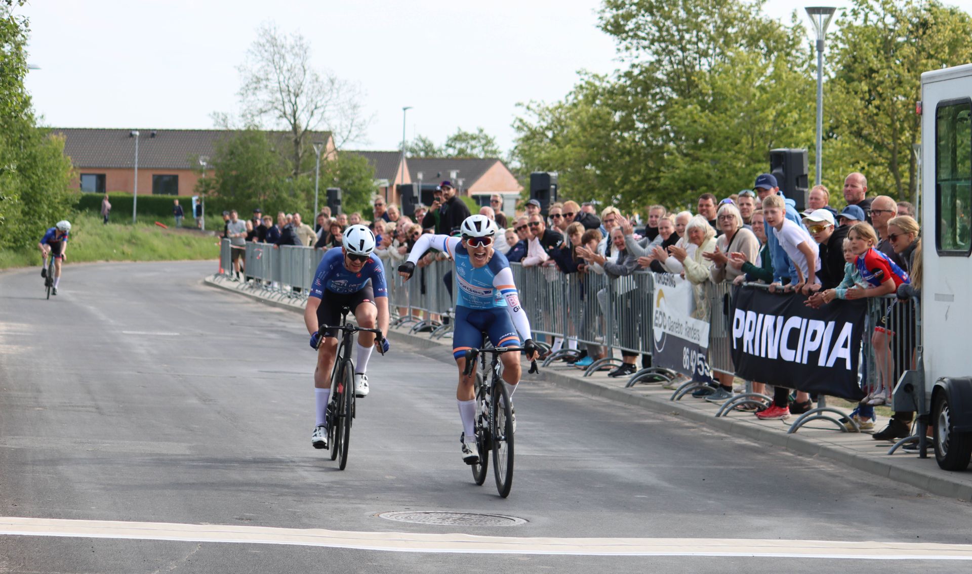 - På den sidste bakke angriber jeg, men begge kommer med på mit hjul. Jeg kan dog mærke, at de begge er presset, så jeg vælger, at holde tempoet. Til sidst slipper Nils Broge, og inden det sidste sving spurter jeg frem og tager fronten, og spurter derfra til sejr, slutter Jacob Schebye!