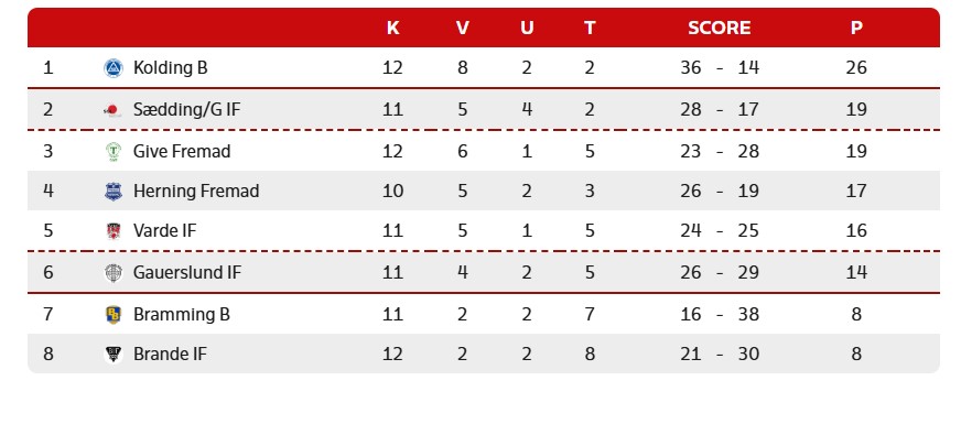 Sejren og de 3 point bringer pt. Give op på rækkens 3. plads med 19 point for 12 kampe. Holdet er matematisk sikret mod direkte nedrykning, og rigtig meget skal gå galt, hvis det formstærke Givehold skal komme i spil til rækkens 6. plads, der giver en billet til nedrykningsspillet.