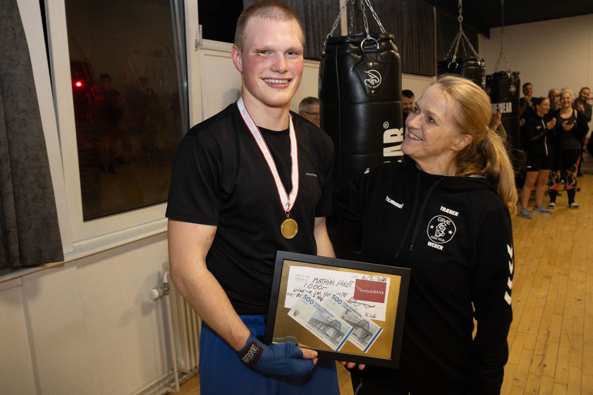 En flot tale efterfulgt af en fortjent anden bølge af stående bifald, mens Margit Weber overrakte den unge bokser både krammere og gaver ad libitum. Smult var det – og faktisk også rørende at se, hvor meget sådan et jysk mesterskab betyder for de folk, Mathias inklusive naturligvis, der har slidt og kæmpet for klubben gennem flere år.