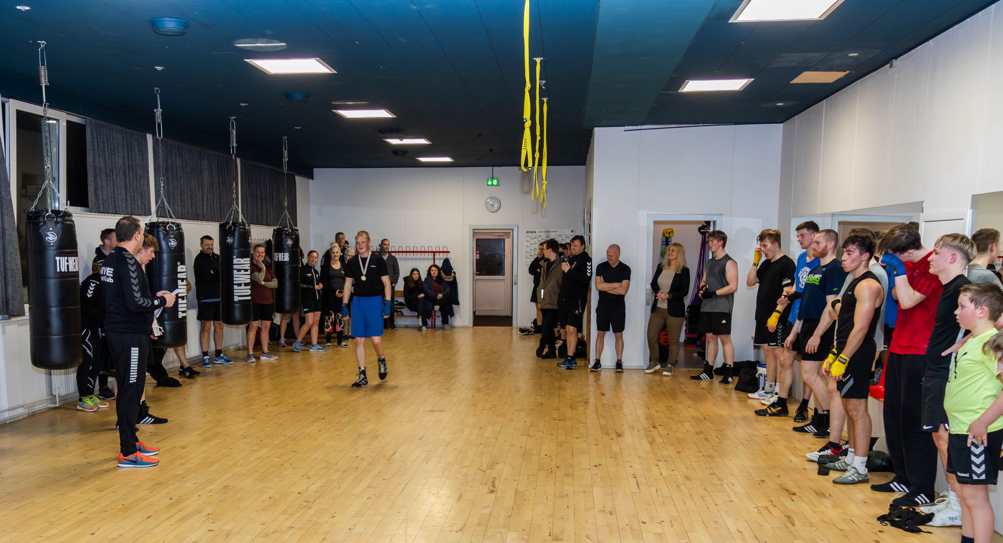 Så var der samling i træningssalen ved Ikærhallen, hvor formanden for bokseklubben, Peter Vilstrup Tomsen stod klar med en fin tale, og hvor der også var masser af folk i salen til denne fine hyldest.