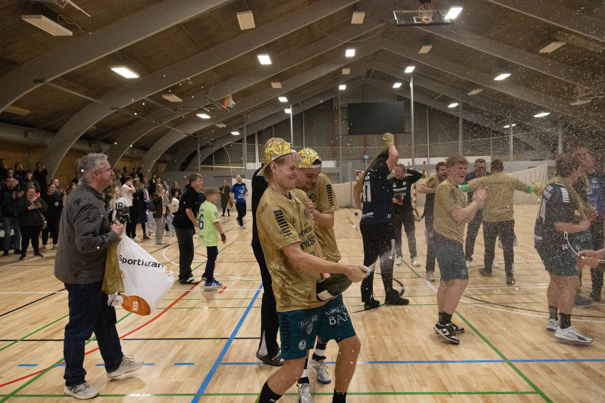 OPRYKNINGSFEST: Siden den 23. marts klokken cirka 17.00 har det været en faktuel kendsgerning, at Give HK i næste sæson stiller op i herrernes 1. division i håndbold. Denne dag lammetævede de lokale håndboldhelte Kolding IF på udebane med 33-24, og det fik champagnepropperne til at springe bagefter i Sydbank Arena.