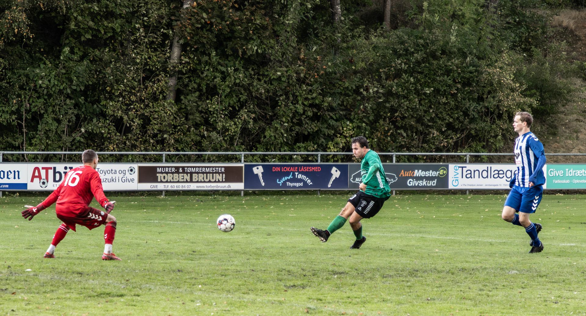 Kristoffer Larsen braget Give på 1-0 i det 4. minut - og her er han tæt på at bringe de grønne på 3-1, men desværre snuppede keeperen forsøget. Foto: Jim Hoff