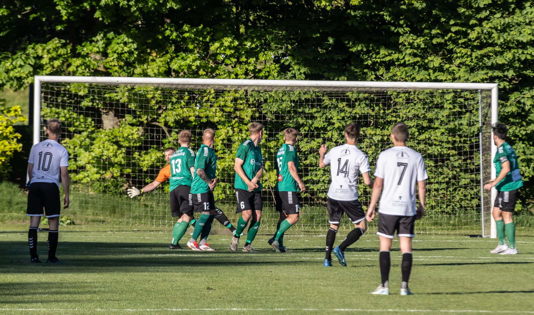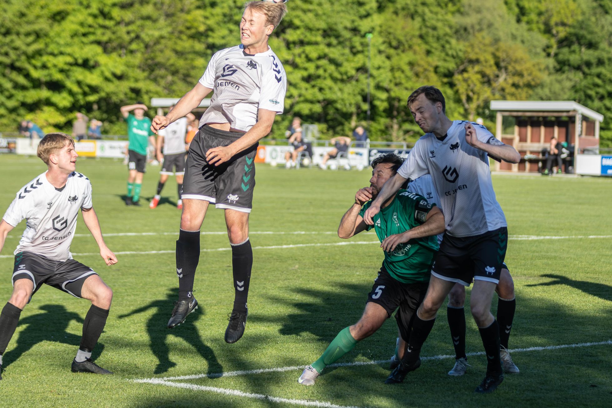 Give fik en del hjørnespark i slutningen af 2. halvleg, hvor gæsterne måtte mobilisere både springkraft og nærkampsgejst for at holde de grønne Air Force One-folk fra fadet. Foto: Jim Hoff