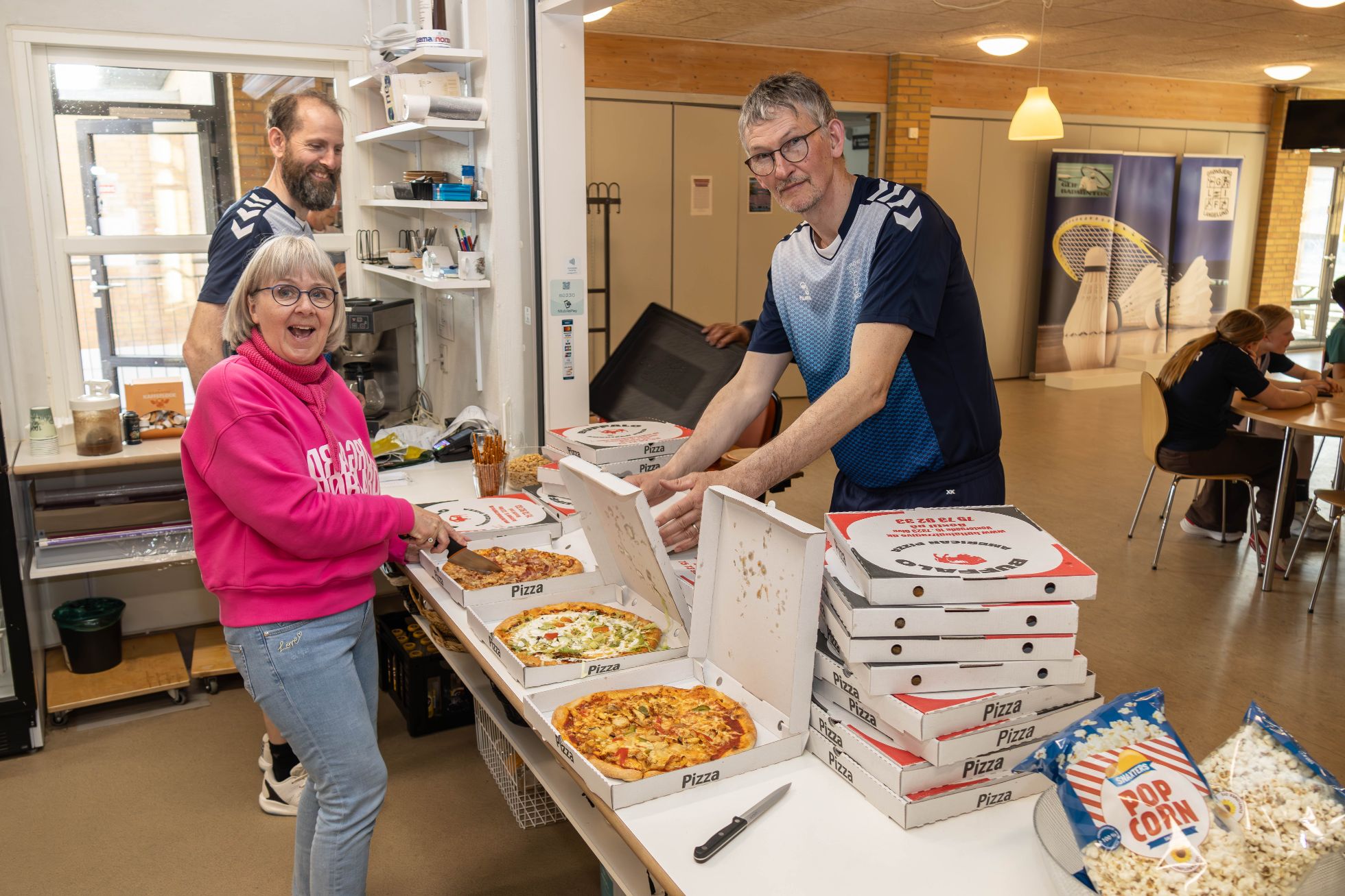 Ib og hustruen Birthe gav naturligvis også et nap med, da der skulle deles pizza ud til børnene. Foto: Jim Hoff