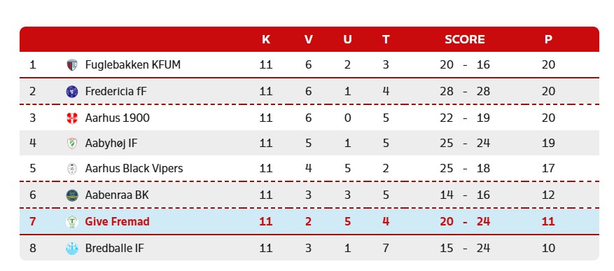 Med nederlaget indtager Give nu rækkens 7. plads med 11 point for 11 kampe. Det er 2. sidst, og lige under Give ligger Bredballe med 10 point. 8. pladsen rykker direkte ned, mens den dårligste 7’er i de to Jyllandsserie 1-rækker også rykker direkte ned. Den bedste 7’er skal så ud at spille om at beholde pladsen i rækken.